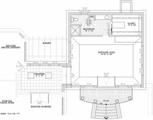 A response to a unique need for a dual-purpose exercise room and second "his" master bath resulted in an unusual plan but traditional elevation to an existing traditional Williamsburg home. The tight plan requirements resulted in an addition that ties into both the Master Bedroom and the existing back sunroom through a small solarium. The addition focuses on and helps to afford privacy to new backyard areas while creating a small garden off of the Master Bedroom.