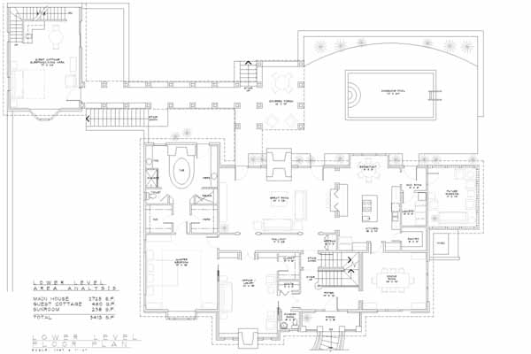 It was designed to be built in phases in order to change with the owner's future needs. For example, the room between the foyer and Master Bedroom could become either an office or a baby nursery. The guesthouse and the pool would be added at a later date.