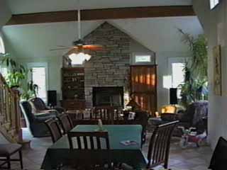 | The family room, adjacent to the kitchen and with new stairs to the upper level, was designed to be a cozy, fun, well-lit center of the home. The stone fireplace with built-in cabinets was designed to recall a earlier home of the owner. | |