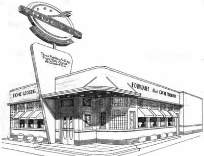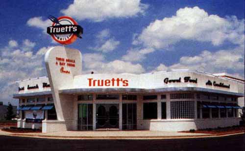 | Alan Dooley's preliminary 1950's retro concept was chosen among other designer's schemes to be developed into the Chic-Fil-A Inc. prototype for the Truett's Grill, which was built in Morrow, Georgia, in 1996. |